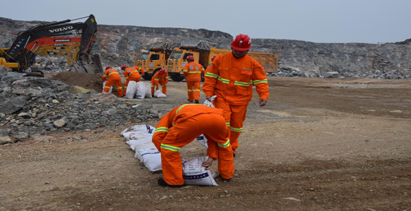 演練活動(dòng)模擬了礦區(qū)突降大雨,并逐漸轉(zhuǎn)變成強(qiáng)風(fēng)暴雨,礦區(qū)能見(jiàn)度差,設(shè)備操作人員無(wú)法正常操作,挖掘機(jī)迎頭工作面被大風(fēng)暴雨侵蝕后,開始出現(xiàn)零星落石。惡劣天氣已影響到礦山安全生產(chǎn),威脅職工的生命安全。礦山安全員接到現(xiàn)場(chǎng)工作人員對(duì)險(xiǎn)情的匯報(bào)后,利用對(duì)講機(jī)通知礦山所有設(shè)備和人員撤離邊坡附近至安全地帶,并立即將現(xiàn)場(chǎng)情況向礦山經(jīng)理進(jìn)行了匯報(bào)。