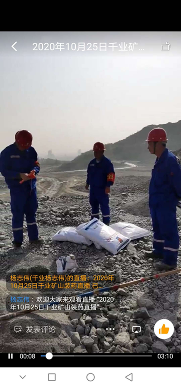 近日,焦作市公安局支隊領導按照河南省廳民爆未端管控全視頻要求,建立覆蓋全市可視頻的釘釘群,組織了焦作市轄區(qū)爆破作業(yè)人員本群,對爆破作業(yè)進行全程跟蹤管理。馬村分公司積極響應南省民爆末端管控全視頻要求,組織爆破作業(yè)相關人員進入“焦作市爆破作業(yè)管控群”,利用將爆破現場進行直播,主要直播人員到位情況(三大員及工程技術人員是否到位)、卸車、電子雷管入庫、裝填、起爆等視頻。
