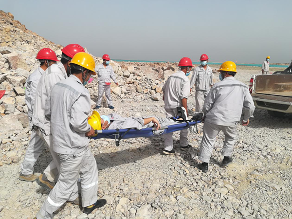 此次演練模擬場景為一名員工從邊坡墜落受傷后的緊急處理過程。接到現(xiàn)場巡視人員報告后,項目部立即啟動應(yīng)急響應(yīng),隨即通知應(yīng)急救援小組火速趕往事故現(xiàn)場進(jìn)行救援。警戒疏散組拉起了安全警戒線,封鎖事故現(xiàn)場,維持現(xiàn)場秩序;醫(yī)療救護(hù)組檢查傷者情況后,對傷員進(jìn)行了簡單的救治和護(hù)理;技術(shù)處置組進(jìn)入高處墜落現(xiàn)場,進(jìn)行了高處墜落后的安全檢查,預(yù)防次生事故;物資保障組馬上聯(lián)系了醫(yī)院,做好了傷員接收的準(zhǔn)備。各小組各司其職,演練現(xiàn)場井然有序,最后救護(hù)車輛趕到現(xiàn)場,將傷員送往醫(yī)院,演練活動結(jié)束。