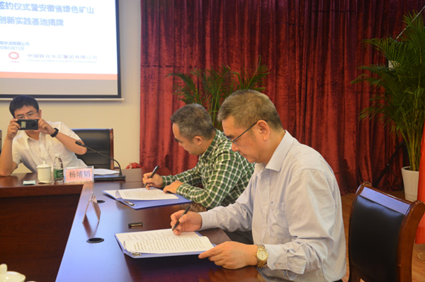 儀式上,滁州中聯(lián)水泥有限公司、安徽省煤田地質(zhì)局勘查研究院安徽省綠色礦山工程研究中心三方進(jìn)行了座談交流。為了深入踐行“綠水青山就是金山銀山”理念,高效推動綠色礦山建設(shè)工作,就如何對礦山綠色勘查、綠色開采、環(huán)境治理與修復(fù)、地質(zhì)環(huán)境監(jiān)測、智慧礦山等環(huán)節(jié)進(jìn)行了探討。隨后,各方派代表現(xiàn)場簽訂了戰(zhàn)略合作協(xié)議進(jìn)行安徽省綠色礦山工程研究中心創(chuàng)新實踐基地揭牌工作。