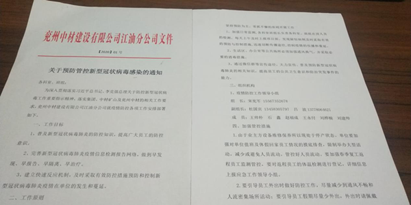春節(jié)期間,一場(chǎng)突如其來(lái)的新冠病毒肺炎席卷全國(guó),疫情防控形勢(shì)嚴(yán)峻。疫情就是命令,按照上級(jí)黨委要求,做出部署和安排,兗州中材第一時(shí)間成立由總經(jīng)理任組長(zhǎng)的疫情防控領(lǐng)導(dǎo)小組,及時(shí)制定和啟動(dòng)應(yīng)急預(yù)案,各分公司和項(xiàng)目部按照疫情成立了疫情防控組織機(jī)構(gòu),成立了疫情防控青年突擊隊(duì),對(duì)所屬分公司積極推出疫情防控制度與措施,認(rèn)真宣傳,抓好落實(shí),嚴(yán)防死守,阻斷疫情傳播,切實(shí)做好疫情防控和復(fù)工復(fù)產(chǎn)等各項(xiàng)工作,切實(shí)保障員工生命安全和身體健康。針對(duì)當(dāng)前疫情情況,分公司具體通過(guò)以下措施確保安全復(fù)工復(fù)產(chǎn):