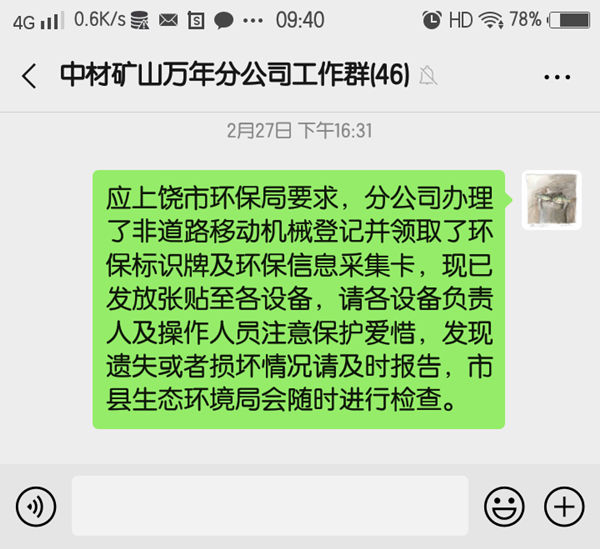 萬年分公司現(xiàn)有28臺(tái)套設(shè)備需要登記取證,經(jīng)過管理人員不懈努力,采集工作順利完成,經(jīng)市、縣環(huán)保部門的審核,分公司于20202月在萬年縣生態(tài)環(huán)境局領(lǐng)取非道路移動(dòng)機(jī)械環(huán)保信息標(biāo)示牌及環(huán)保信息采集卡。