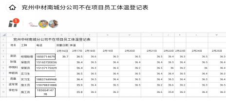 分公司建立多種檢查制度,通過現(xiàn)場(chǎng)人員現(xiàn)場(chǎng)檢查、在項(xiàng)目隔離人員與未返工員工自查等多種形式進(jìn)行人員健康狀況監(jiān)測(cè),并如實(shí)記錄,如有異常者及時(shí)送醫(yī)就診,做到“早發(fā)現(xiàn),早隔離,早上報(bào),早治療”,切斷傳播途徑,杜絕疫情蔓延。