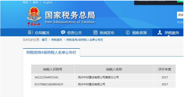 近日,稅務(wù)機關(guān)組織實施的2017年度納稅信用等級評定結(jié)果“出爐”,兗州中材建設(shè)有限公司繼2015、2016年度榮獲A級納稅信用企業(yè)后,再次榮獲A級納稅信用企業(yè)。
