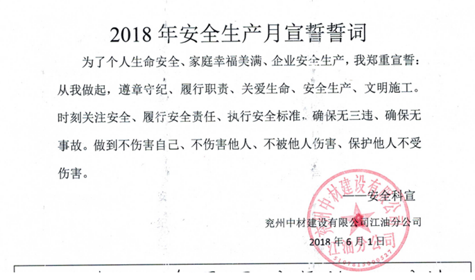 會(huì)上,安全科傳達(dá)《2018年安全生產(chǎn)月活動(dòng)實(shí)施方案》并對(duì)安全工作進(jìn)行闡述與部署。組織員工觀看安全教育宣傳片,通過對(duì)典型真實(shí)案例的生動(dòng)再現(xiàn),使員工真正從思想深處懂得安全,重視安全,時(shí)時(shí)刻刻想著安全,增強(qiáng)職工安全意識(shí),強(qiáng)化安全理念,提高職工的安全素質(zhì)。項(xiàng)目副經(jīng)理強(qiáng)調(diào),安全是社會(huì)經(jīng)濟(jì)發(fā)展的需要,是企業(yè)自身發(fā)展的需要,是從業(yè)人員參與勞動(dòng)的需要。要樹立“紅線意識(shí)”,堅(jiān)決落實(shí)崗位責(zé)任;加強(qiáng)安全教育宣傳,定期排查隱患,完善安全體制建設(shè),依法治安、依法作業(yè);堅(jiān)持“安全第一、預(yù)防為主、綜合治理”的方針,持續(xù)有效推動(dòng)公司安全生產(chǎn)形勢穩(wěn)定發(fā)展。項(xiàng)目經(jīng)理要求,一是要加強(qiáng)領(lǐng)導(dǎo)、高度重視,正確把握當(dāng)前安全形勢,突出落實(shí)安全責(zé)任主線,深刻認(rèn)識(shí)開展“安全生產(chǎn)月”活動(dòng)的重要意義;二是要圍繞主題、協(xié)調(diào)推進(jìn),大力宣傳黨和國家的安全生產(chǎn)方針政策、法律法規(guī),通過開展一系列安全活動(dòng),進(jìn)一步營造“關(guān)愛生命、關(guān)注安全”的安全氛圍;三是要扎實(shí)開展、狠抓落實(shí),以“安全生產(chǎn)月”活動(dòng)為契機(jī),在保持雙體系有效運(yùn)行的同時(shí)做到統(tǒng)一思想、提高安全意識(shí),為公司安全穩(wěn)定、和諧發(fā)展提供有力保障;四是要強(qiáng)化培訓(xùn)、提升意識(shí),圍繞國家法律法規(guī),開展員工安全教育培訓(xùn),全面提升全員綜合安全素質(zhì)及法制意識(shí),強(qiáng)化依法治企、依規(guī)治企。會(huì)議最后,項(xiàng)目部組織全體員工進(jìn)行安全月宣誓和簽名,安全生產(chǎn)月正式拉開帷幕。