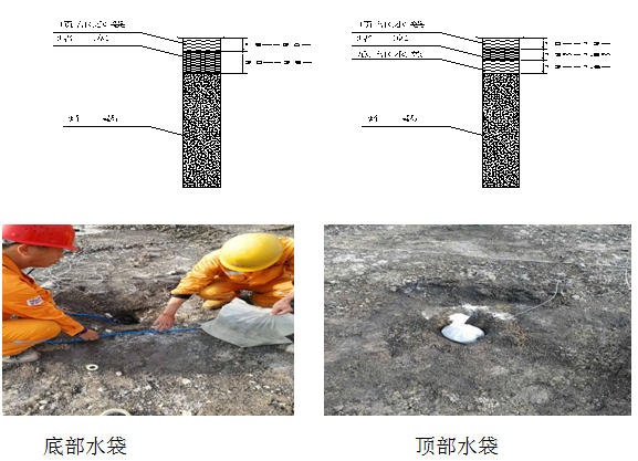 以上單水袋、雙水袋的設(shè)置位置是在裝藥完成之后,在堵塞段中考慮設(shè)置的水袋位置。底部水袋:是指自裝藥完成后,在堵塞段的底部安放的水袋,其水袋與炸藥緊密接觸,水袋安放注水后再行填塞;頂部水袋:是指在填塞的最后時(shí),預(yù)留一定的空間安放水袋;水袋注水后都是填塞的一部分,與填塞形成一個(gè)整體。