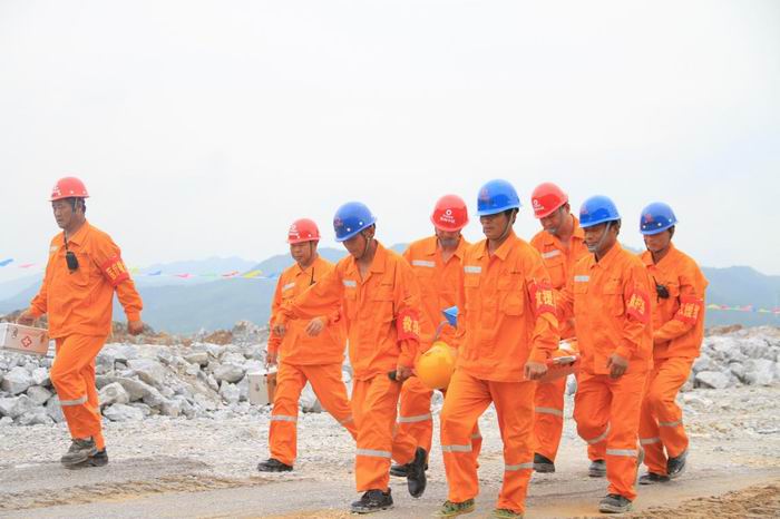 為增加演練的真實(shí)性和有效性,在應(yīng)急救援正式演練前,瑞金項(xiàng)目部在演練區(qū)域進(jìn)行了一次真實(shí)的爆破,由于爆破剛剛結(jié)束,各救援組成員均在各自不同的崗位上,擺脫以往應(yīng)急演練時(shí)各救援組已經(jīng)集結(jié)等待救援的模板形式,通過人員的集結(jié),檢驗(yàn)了救援組集結(jié)速度、效率、協(xié)同及時(shí)效。