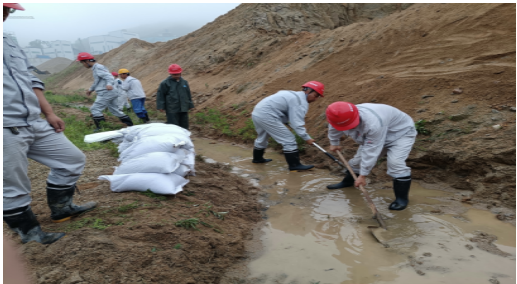 接到通知后,生產(chǎn)科,立即調(diào)用裝載機(jī)趕到現(xiàn)場,組織員工帶好防汛裝備趕到現(xiàn)場?,F(xiàn)場負(fù)責(zé)人周浩講“裝載機(jī)立即清理邊坡上的塌陷料,生產(chǎn)科組織人員去上游疏通水道,安全科和設(shè)備科組織人員去邊坡上面挖掘水溝設(shè)置擋墻,避免水流二次破壞邊坡”,任務(wù)分配完畢后,各科室?guī)ьI(lǐng)人員緊鑼密鼓的組織起來。