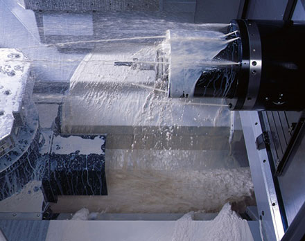 高速加工的高生產(chǎn)率所帶來的切屑量是驚人的。為了確保切屑可靠去除,加工室里的擋板幾乎呈垂直的構(gòu)造,切屑與主軸頭部和頂部噴出的冷卻液一起流入工作臺(tái)正下方寬敞的中心切屑槽內(nèi),將與冷卻液一起被沖刷到機(jī)身外部。附帶過濾功能的提升排屑器,能確保始終供應(yīng)清潔的冷卻液。
